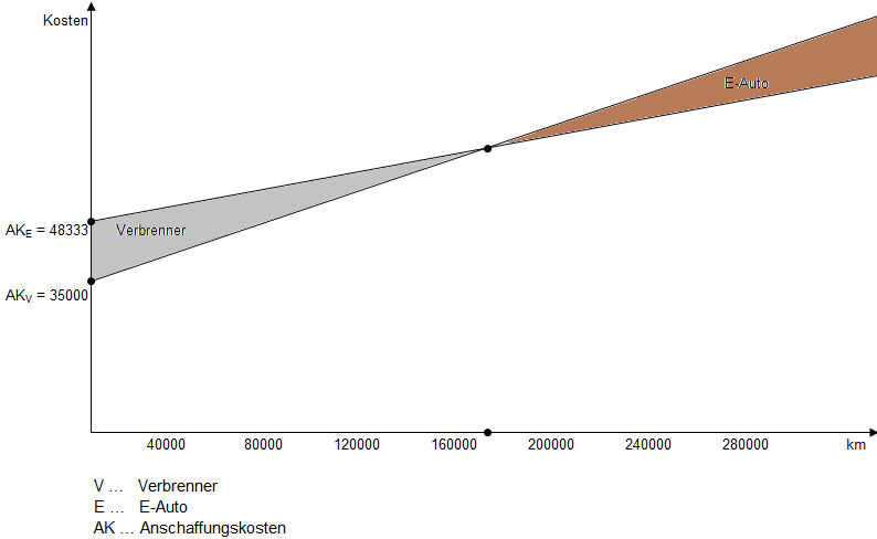 Im konkreten Fall verursacht das E-Kfz ab 162.598 km weniger Gesamtkosten als der Verbrenner.